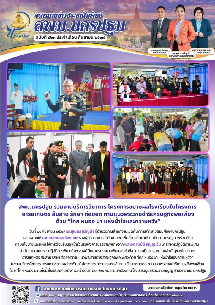 สพม.นครปฐม ร่วมงานบริการวิชาการ โครงการขยายผลโรงเรียนในโครงการ อารยเกษตร สืบสาน รักษา ต่อยอด ตามแนวพระราชดำริเศรษฐกิจพอเพียง ด้วย “โคก หนอง นา แห่งน้ำใจและความหวัง” 09/21/202409/27/2024 ประชา สัมพันธ์ จดหมายข่าวเขต Views: 205 ประชา สัมพันธ์