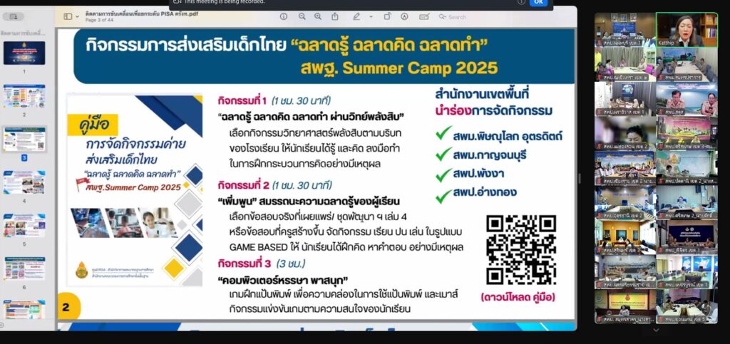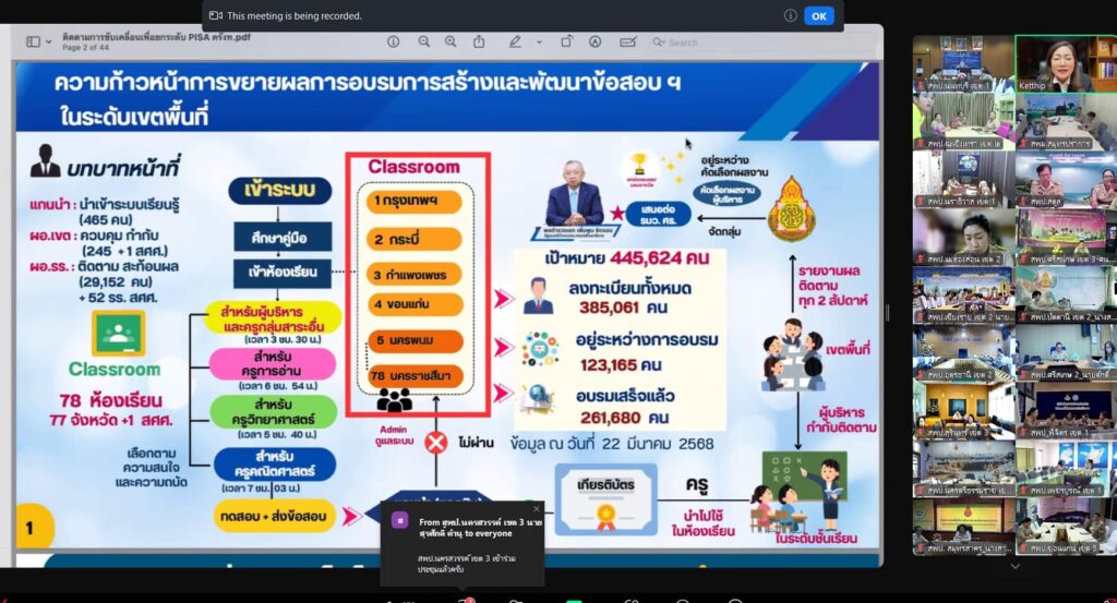 วันที่ ๒๔ มีนาคม ๒๕๖๘ ดร.สุเนตร ขวัญดำ ผู้อำนวยการสำนักงานเขตพื้นที่การศึกษามัธยมศึกษานครปฐม พร้อมด้วย ดร.ธีรศักดิ์ จำนงค์เนียร รองผู้อำนวยการสำนักงานเขตพื้นที่การศึกษามัธยมศึกษานครปฐม และ ดร.ศศิธร ศรีพรหม ศึกษานิเทศก์ ชำนาญการพิเศษ ปฏิบัติหน้าที่ผู้อำนวยการกลุ่มนิเทศ ติดตามและประเมินผลการจัดการศึกษา เข้าร่วมการประชุมผู้อำนวยการสำนักงานเขตพื้นที่การศึกษา เพื่อติดตามผลการดำเนินงาน ขับเคลื่อน PISA และ O-NET สพฐ. ครั้งที่ ๒๔ โดยมี ดร.เกศทิพย์ ศุภวานิช รองเลขาธิการคณะกรรมการการศึกษาขั้นพื้นฐาน เป็นประธานการประชุม ผ่านระบบแอปพลิเคชัน Zoom Meeting