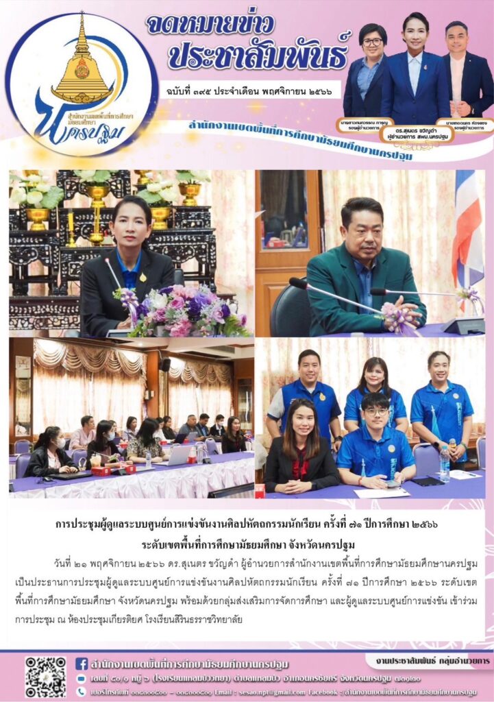 การประชุมผู้ดูแลระบบศูนย์การแข่งขัน งานศิลปหัตถกรรมนักเรียน ครั้งที่ ๗๑ ปีการศึกษา ๒๕๖๖ ระดับเขตพื้นที่การศึกษามัธยมศึกษา จังหวัดนครปฐม 11/21/202312/13/2023 ประชา สัมพันธ์ จดหมายข่าวเขต Views: 127 ประชา สัมพันธ์