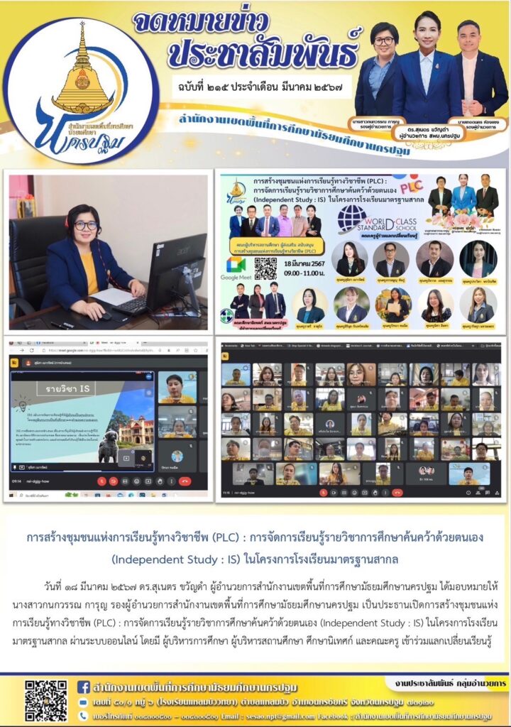 การสร้างชุมชนแห่งการเรียนรู้ทางวิชาชีพ (PLC) : การจัดการเรียนรู้รายวิชาการศึกษาค้นคว้าด้วยตนเอง (Independent Study : IS) ในโครงการโรงเรียนมาตรฐานสากล 03/18/2024 ประชา สัมพันธ์ จดหมายข่าวเขต Views: 434 ประชา สัมพันธ์