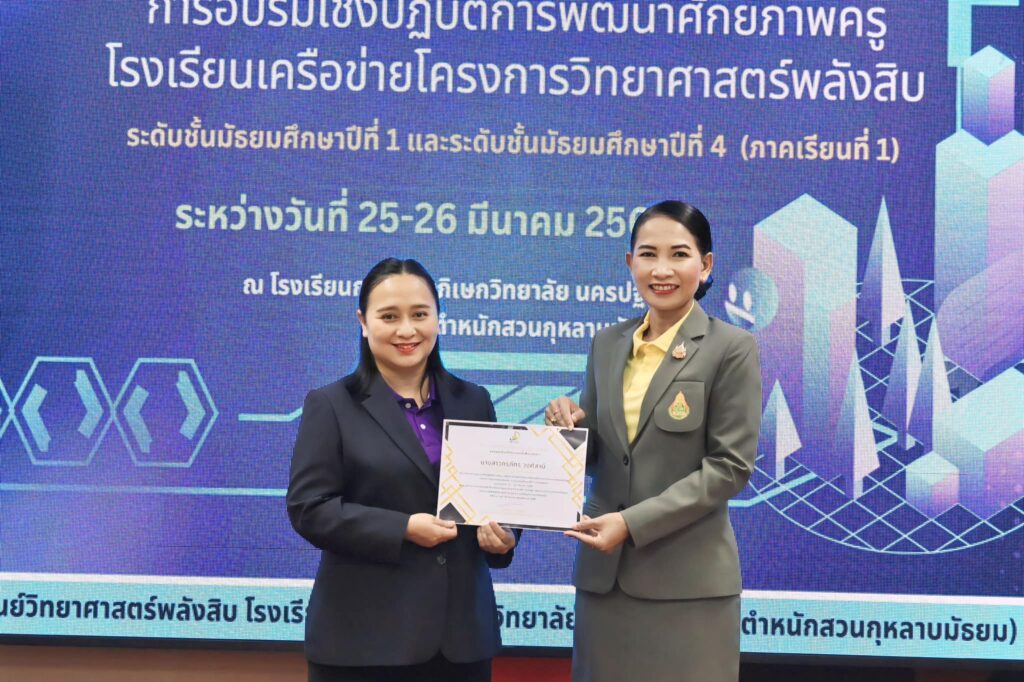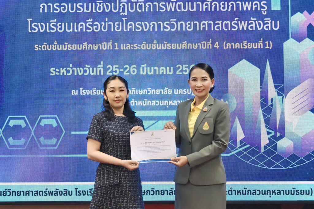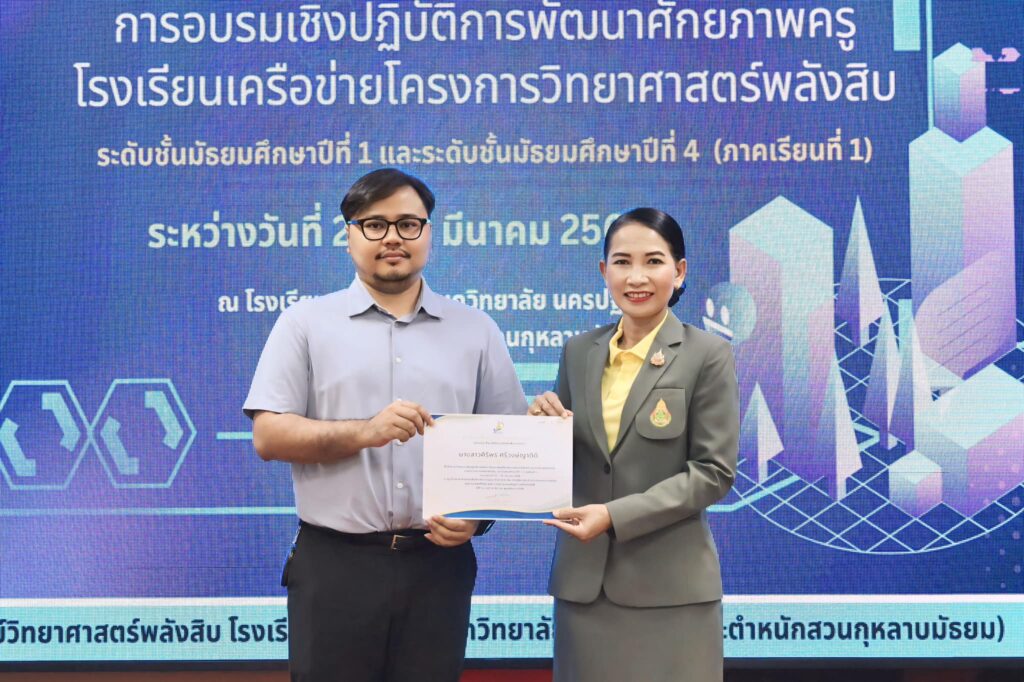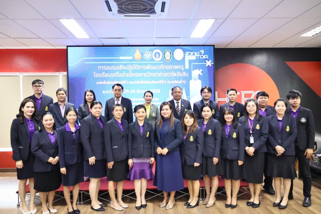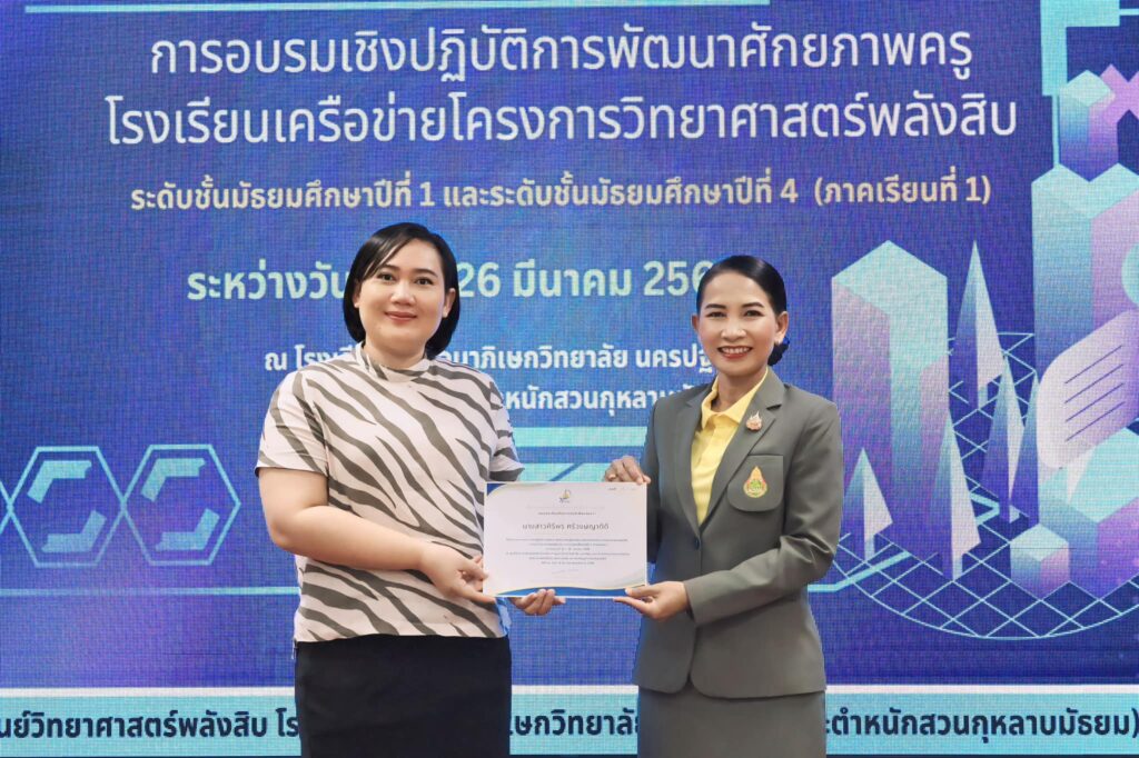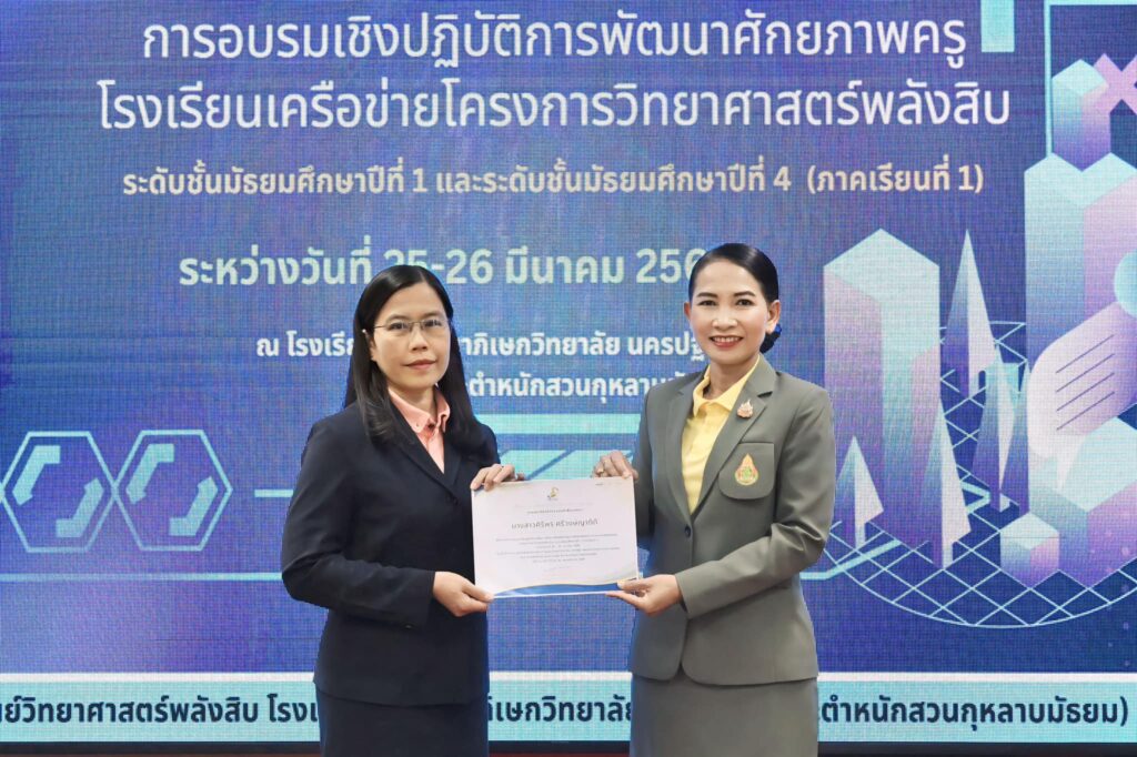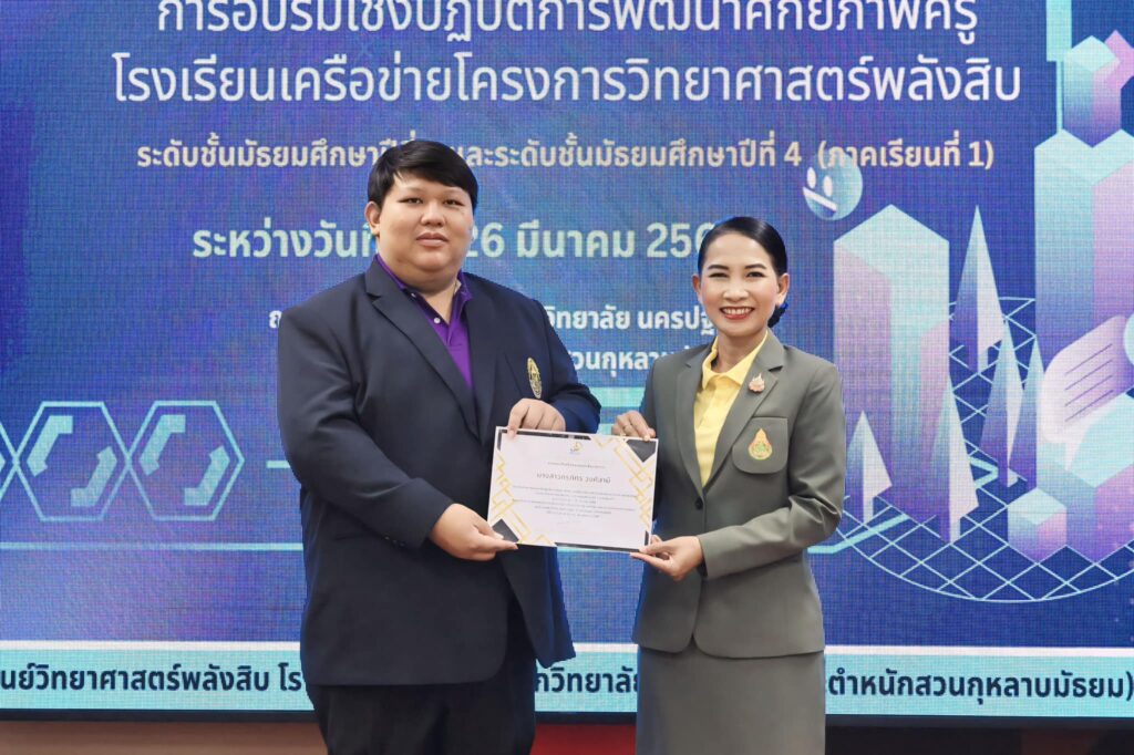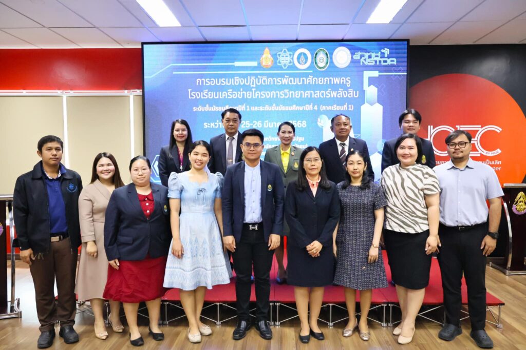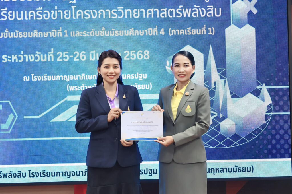 วันที่ ๒๕ มีนาคม ๒๕๖๘ ดร.สุเนตร ขวัญดำ ผู้อำนวยการสำนักงานเขตพื้นที่การศึกษามัธยมศึกษานครปฐม เป็นประธานเปิดการอบรมเชิงปฏิบัติการการพัฒนาบุคลากรและการจัดการเรียนรู้โรงเรียนเครือข่ายตามแนวทางโครงการวิทยาศาสตร์ พลังสิบ ระดับมัธยมศึกษาปีที่ ๑ และระดับมัธยมศึกษาปีที่ ๔ (ภาคเรียนที่ ๑) โดยมี โรงเรียนวัดไร่ขิงวิทยา และโรงเรียนสิรินธรราชวิทยาลัย นำบุคลากรครูเข้าอบรม จำนวน ๑๘ คน เนื่องจากเป็นโรงเรียนที่สมัครเข้าโครงการวิทยาศาสตร์พลังสิบและเพื่อเตรียมความพร้อมในการเปิดห้องเรียนวิทยาศาสตร์พลังสิบในปีการศึกษา ๒๕๖๘ ณ โรงเรียนกาญจนาภิเษกวิทยาลัย นครปฐม (พระตำหนักสวนกุหลาบมัธยม) ทั้งนี้ ได้รับความอนุเคราะห์จาก ว่าที่ร้อยตรีพิษณุพล แตงอ่อน ผู้อำนวยการโรงเรียนกาญจนาภิเษกวิทยาลัย นครปฐม (พระตำหนักสวนกุหลาบมัธยม) พร้อมคณะบุคลากรครูในโครงการวิทยาศาสตร์พลังสิบเป็นวิทยากรในการฝึกอบรม และอนุเคราะห์สถานที่สำหรับการจัดอบรม