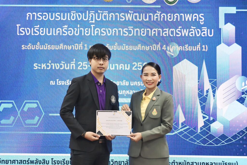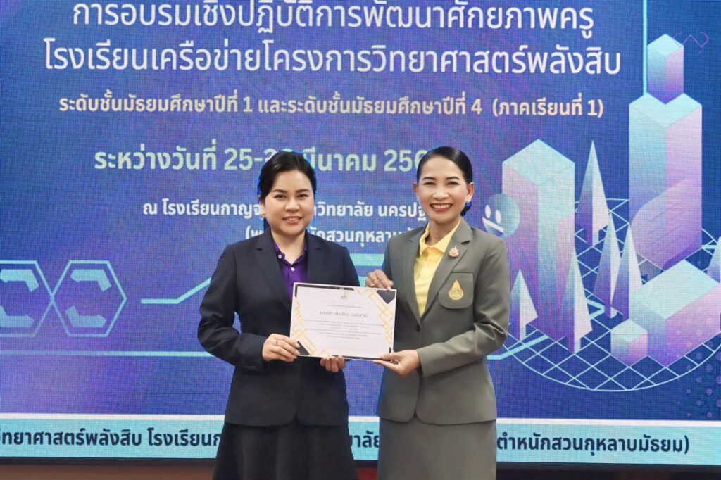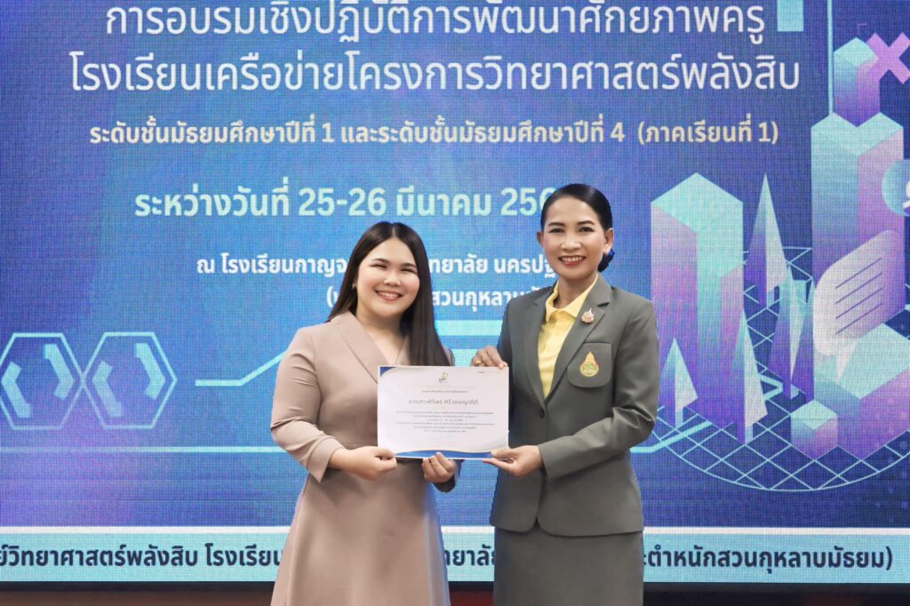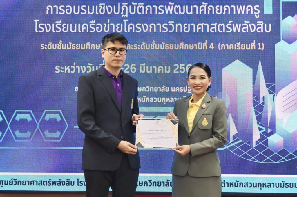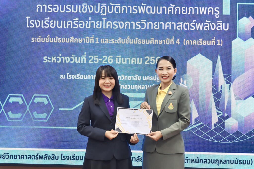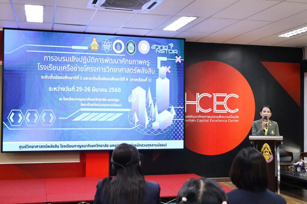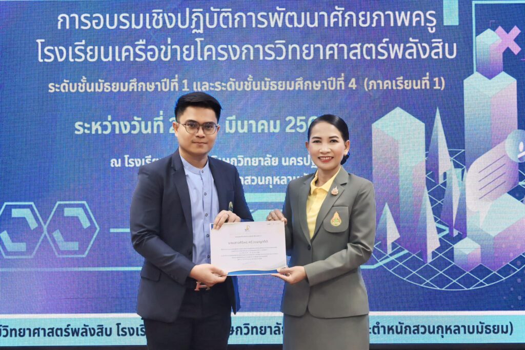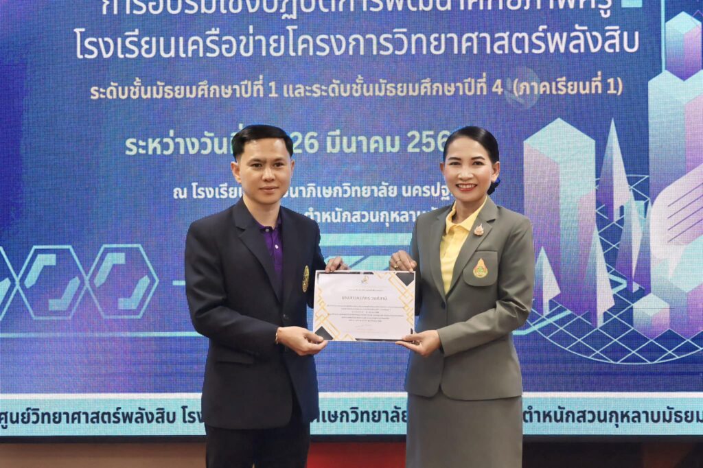 วันที่ ๒๕ มีนาคม ๒๕๖๘ ดร.สุเนตร ขวัญดำ ผู้อำนวยการสำนักงานเขตพื้นที่การศึกษามัธยมศึกษานครปฐม เป็นประธานเปิดการอบรมเชิงปฏิบัติการการพัฒนาบุคลากรและการจัดการเรียนรู้โรงเรียนเครือข่ายตามแนวทางโครงการวิทยาศาสตร์ พลังสิบ ระดับมัธยมศึกษาปีที่ ๑ และระดับมัธยมศึกษาปีที่ ๔ (ภาคเรียนที่ ๑) โดยมี โรงเรียนวัดไร่ขิงวิทยา และโรงเรียนสิรินธรราชวิทยาลัย นำบุคลากรครูเข้าอบรม จำนวน ๑๘ คน เนื่องจากเป็นโรงเรียนที่สมัครเข้าโครงการวิทยาศาสตร์พลังสิบและเพื่อเตรียมความพร้อมในการเปิดห้องเรียนวิทยาศาสตร์พลังสิบในปีการศึกษา ๒๕๖๘ ณ โรงเรียนกาญจนาภิเษกวิทยาลัย นครปฐม (พระตำหนักสวนกุหลาบมัธยม) ทั้งนี้ ได้รับความอนุเคราะห์จาก ว่าที่ร้อยตรีพิษณุพล แตงอ่อน ผู้อำนวยการโรงเรียนกาญจนาภิเษกวิทยาลัย นครปฐม (พระตำหนักสวนกุหลาบมัธยม) พร้อมคณะบุคลากรครูในโครงการวิทยาศาสตร์พลังสิบเป็นวิทยากรในการฝึกอบรม และอนุเคราะห์สถานที่สำหรับการจัดอบรม
