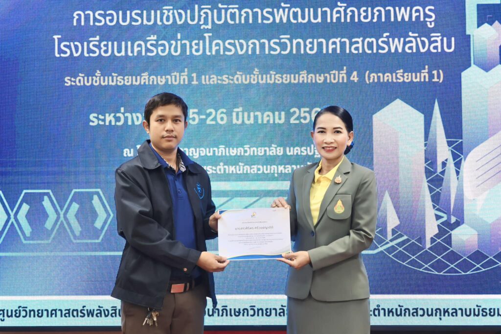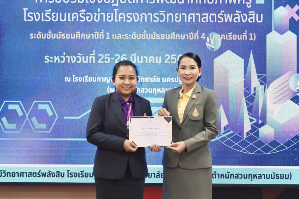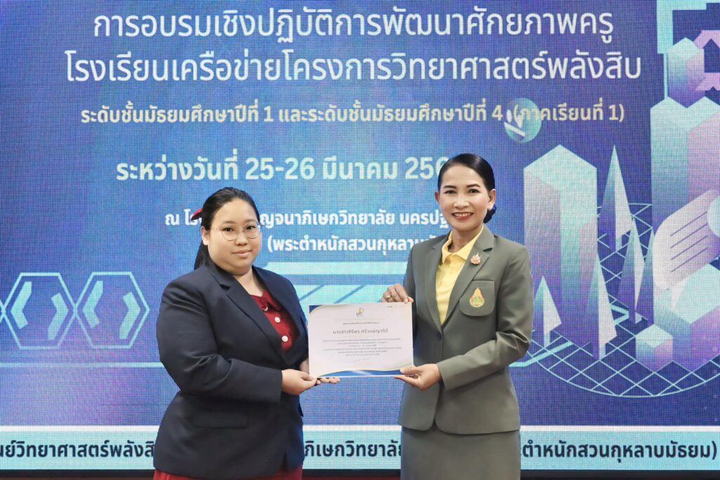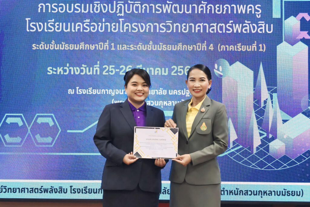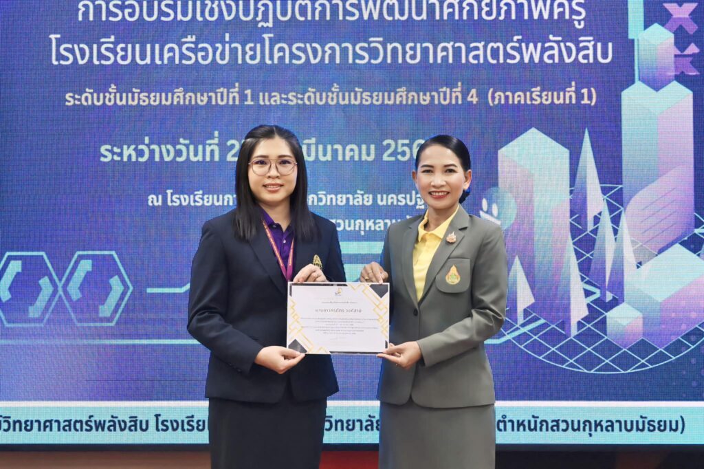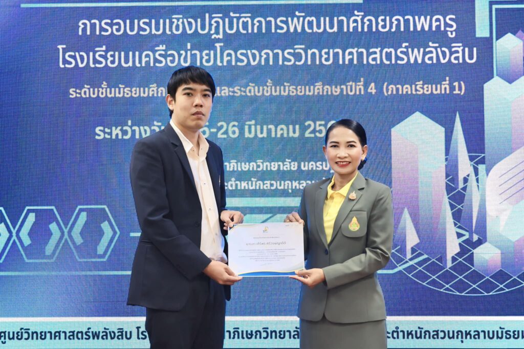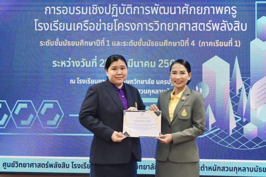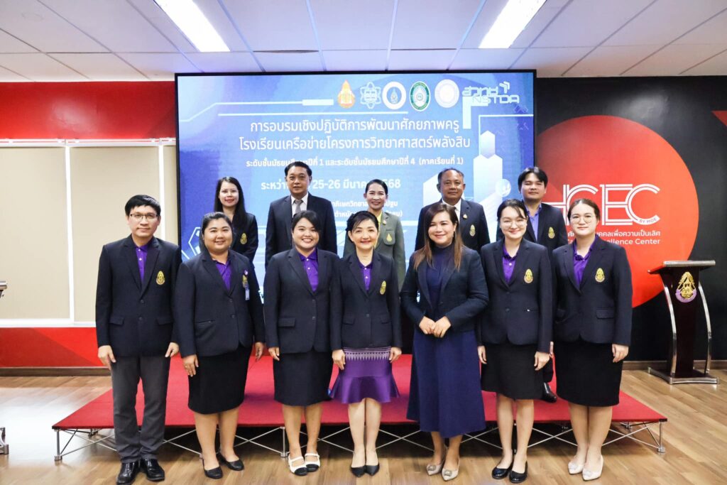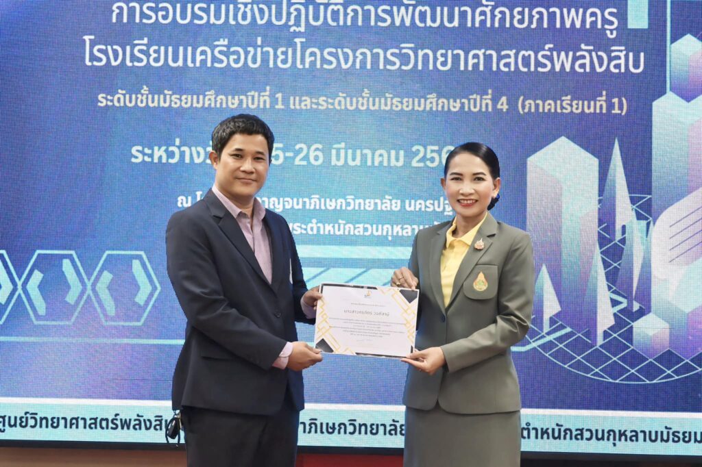 วันที่ ๒๕ มีนาคม ๒๕๖๘ ดร.สุเนตร ขวัญดำ ผู้อำนวยการสำนักงานเขตพื้นที่การศึกษามัธยมศึกษานครปฐม เป็นประธานเปิดการอบรมเชิงปฏิบัติการการพัฒนาบุคลากรและการจัดการเรียนรู้โรงเรียนเครือข่ายตามแนวทางโครงการวิทยาศาสตร์ พลังสิบ ระดับมัธยมศึกษาปีที่ ๑ และระดับมัธยมศึกษาปีที่ ๔ (ภาคเรียนที่ ๑) โดยมี โรงเรียนวัดไร่ขิงวิทยา และโรงเรียนสิรินธรราชวิทยาลัย นำบุคลากรครูเข้าอบรม จำนวน ๑๘ คน เนื่องจากเป็นโรงเรียนที่สมัครเข้าโครงการวิทยาศาสตร์พลังสิบและเพื่อเตรียมความพร้อมในการเปิดห้องเรียนวิทยาศาสตร์พลังสิบในปีการศึกษา ๒๕๖๘ ณ โรงเรียนกาญจนาภิเษกวิทยาลัย นครปฐม (พระตำหนักสวนกุหลาบมัธยม) ทั้งนี้ ได้รับความอนุเคราะห์จาก ว่าที่ร้อยตรีพิษณุพล แตงอ่อน ผู้อำนวยการโรงเรียนกาญจนาภิเษกวิทยาลัย นครปฐม (พระตำหนักสวนกุหลาบมัธยม) พร้อมคณะบุคลากรครูในโครงการวิทยาศาสตร์พลังสิบเป็นวิทยากรในการฝึกอบรม และอนุเคราะห์สถานที่สำหรับการจัดอบรม