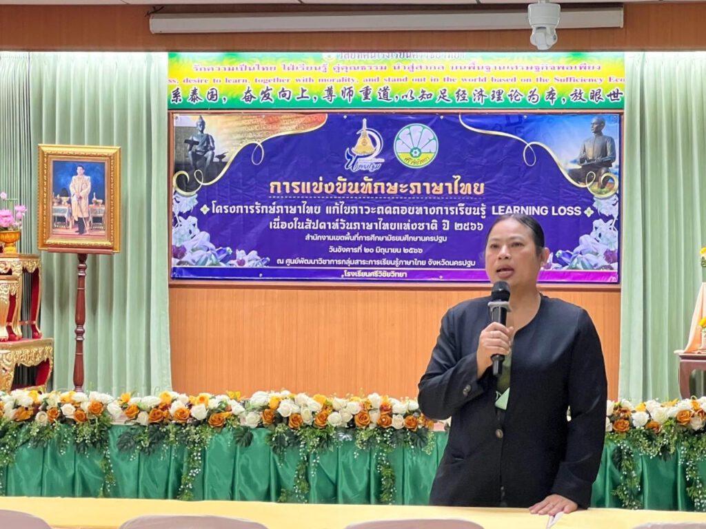 นางนิสา บรรจงการ ผู้อำนวยการสำนักงานเขตพื้นที่การศึกษามัธยมศึกษานครปฐม มอบหมายให้นางสาวกนกวรรณ การุญ รองผู้อำนวยการสำนักงานเขตพื้นที่การศึกษามัธยมศึกษานครปฐม เป็นประธานในพิธีเปิดการแข่งขันทักษะภาษาไทย โครงการรักษ์ภาษาไทย แก้ไขภาวะถดถอยทางการเรียนรู้ (Learning Loss) เนื่องในสัปดาห์วันภาษาไทยแห่งชาติ ปี 2566 โดยความร่วมมือของกลุ่มนิเทศ ติดตามและประเมินผลการจัดการศึกษา สำนักงานเขตพื้นที่การศึกษามัธยมศึกษานครปฐม และศูนย์พัฒนาวิชาการกลุ่มสาระการเรียนรู้ภาษาไทย จังหวัดนครปฐม โรงเรียนศรีวิชัยวิทยา ณ โรงเรียนศรีวิชัยวิทยา อำเภอเมือง จังหวัดนครปฐม