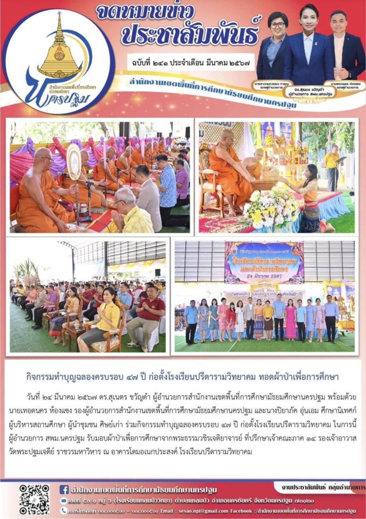 กิจกรรมทำบุญฉลองครบรอบ ๔๗ ปี ก่อตั้งโรงเรียนปรีดารามวิทยาคม ทอดผ้าป่าเพื่อการศึกษา 03/24/202403/25/2024 ประชา สัมพันธ์ จดหมายข่าวเขต Views: 368 ประชา สัมพันธ์