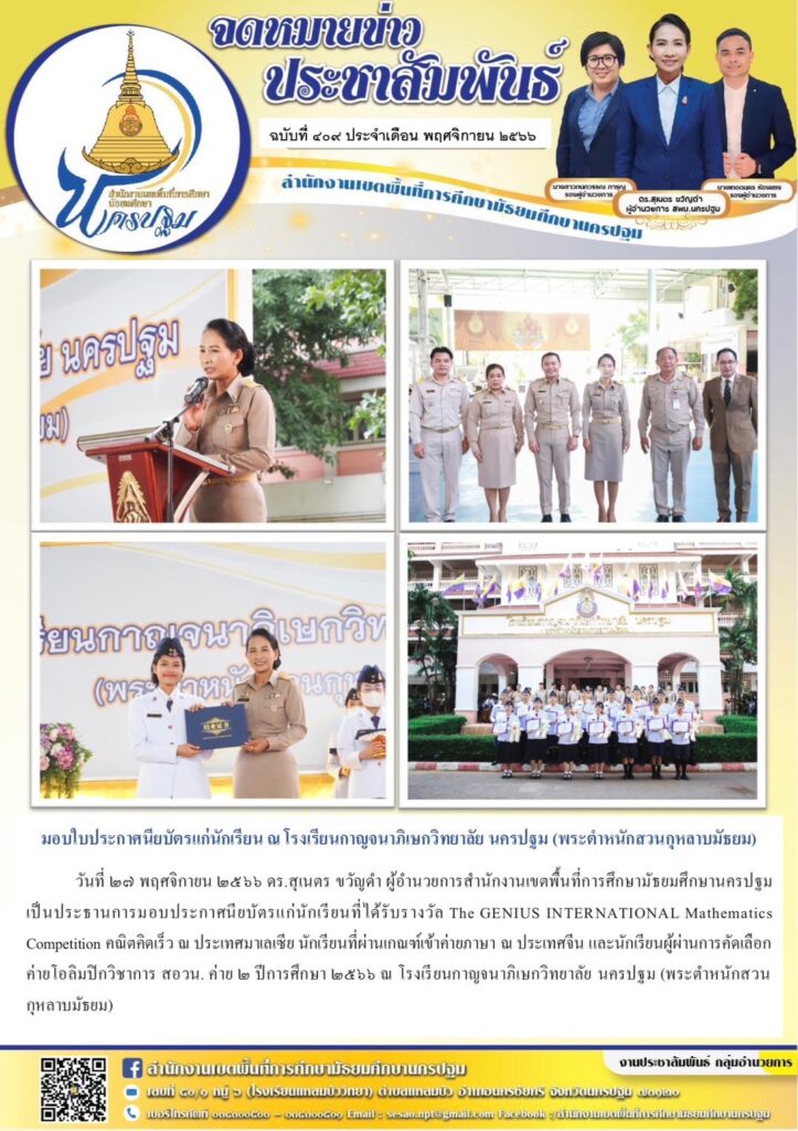 ผอ. สพม.นครปฐม มอบใบประกาศนียบัตรแก่นักเรียน ณ โรงเรียนกาญจนาภิเษกวิทยาลัย นครปฐม (พระตำหนักสวนกุหลาบมัธยม) 11/27/202312/13/2023 ประชา สัมพันธ์ จดหมายข่าวเขต Views: 202 ประชา สัมพันธ์