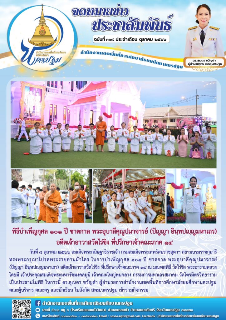พิธีบำเพ็ญกุศล ๑๐๑ ปี ชาตกาล พระอุบาลีคุณูปมาจารย์ (ปัญญา อินฺทปญฺญมหาเถร) อดีตเจ้าอาวาสวัดไร่ขิง ที่ปรึกษาเจ้าคณะภาค ๑๔ 10/09/202310/09/2023 admin จดหมายข่าวเขต Views: 334 admin