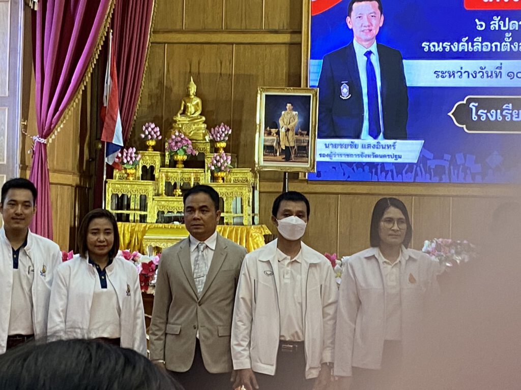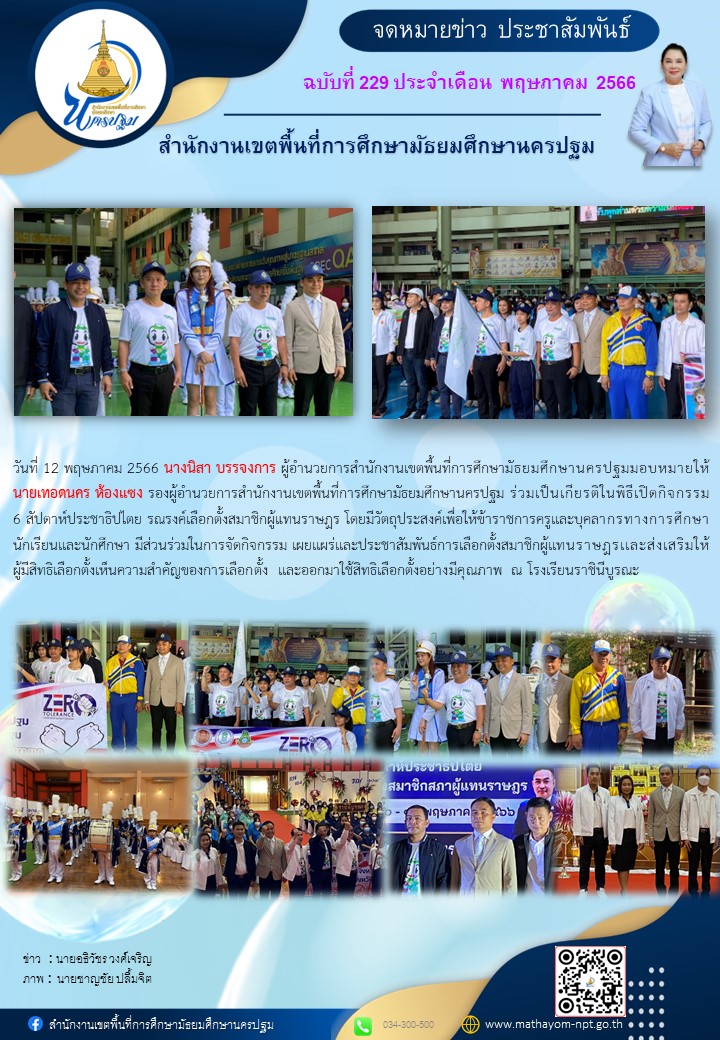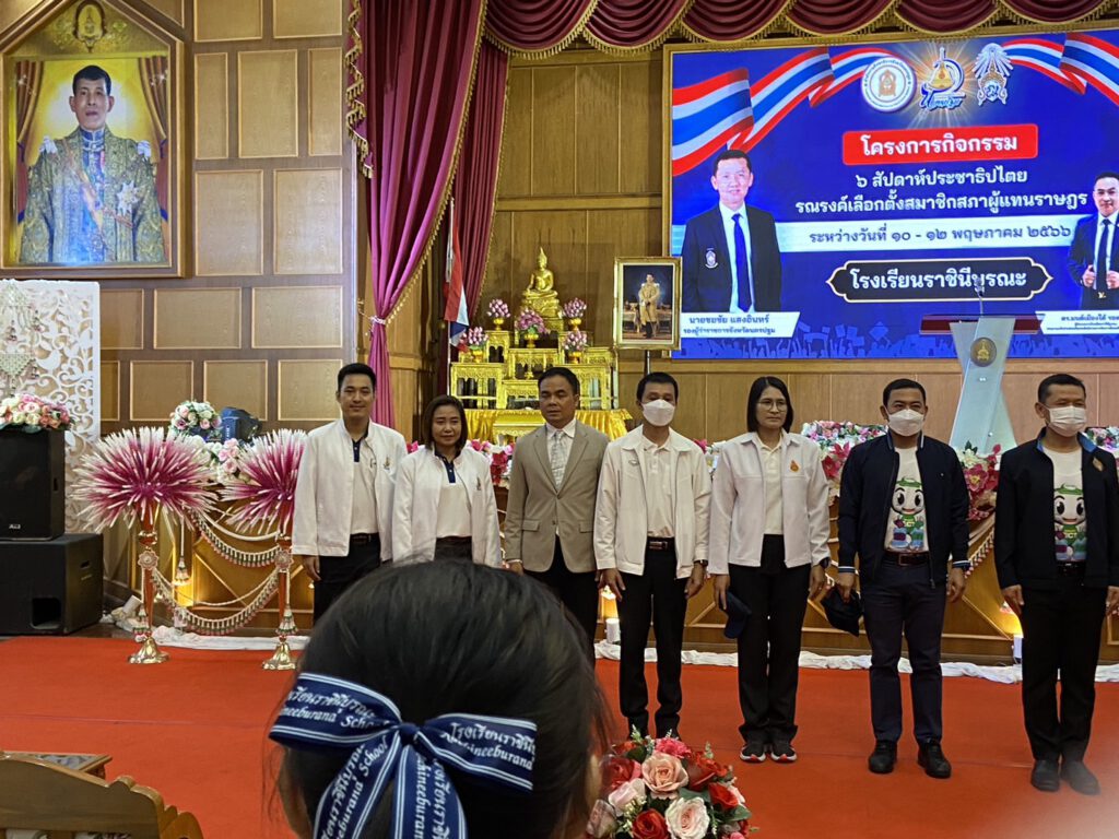 วันที่ 12 พฤษภาคม 2566 นางนิสา บรรจงการ ผู้อำนวยการสำนักงานเขตพื้นที่การศึกษามัธยมศึกษานครปฐมมอบหมายให้ นายเทอดนคร ห้องแซง รองผู้อำนวยการสำนักงานเขตพื้นที่การศึกษามัธยมศึกษานครปฐม ร่วมเป็นเกียรติในพิธีเปิดกิจกรรม 6 สัปดาห์ประชาธิปไตย รณรงค์เลือกตั้งสมาชิกผู้แทนราษฎร โดยมีวัตถุประสงค์เพื่อให้ข้าราชการครูเเละบุคลากรทางการศึกษา นักเรียนเเละนักศึกษา มีส่วนร่วมในการจัดกิจกรรม เผยเเผร่เเละประชาสัมพันธ์การเลือกตั้งสมาชิกผู้เเทนราษฎรเเละส่งเสริมให้ผู้มีสิทธิเลือกตั้งเห็นความสำคัญของการเลือกตั้ง เเละออกมาใช้สิทธิเลือกตั้งอย่างมีคุณภาพ ณ โรงเรียนราชินีบูรณะ