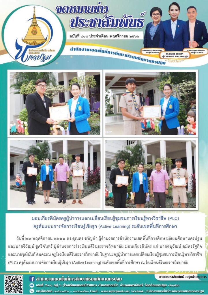 มอบเกียรติบัตรครูผู้นำการแลกเปลี่ยนเรียนรู้ชุมชนการเรียนรู้ทางวิชาชีพ (PLC) ครูต้นแบบการจัดการเรียนรู้เชิงรุก (Active Learning) ระดับเขตพื้นที่การศึกษา 11/29/202312/13/2023 ประชา สัมพันธ์ จดหมายข่าวเขต Views: 356 ประชา สัมพันธ์