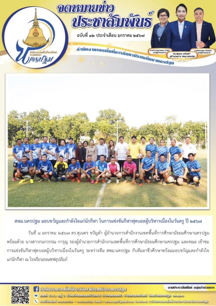 สพม.นครปฐม มอบขวัญและกำลังใจแก่นักกีฬา ในการแข่งขันกีฬาฟุตบอลผู้บริหารเนื่องในวันครู ปี ๒๕๖๗ 01/08/202401/23/2024 ประชา สัมพันธ์ จดหมายข่าวเขต Views: 184 ประชา สัมพันธ์