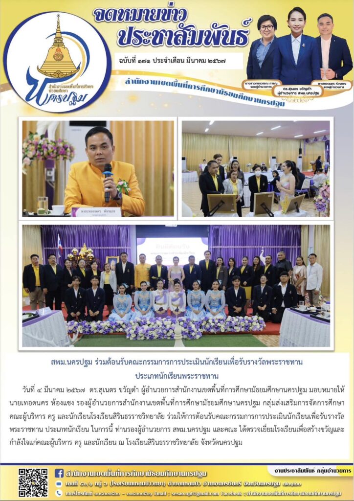 สพม.นครปฐม ร่วมต้อนรับคณะกรรมการการประเมินนักเรียนเพื่อรับรางวัลพระราชทาน ประเภทนักเรียนพระราชทาน 03/04/202403/05/2024 ประชา สัมพันธ์ จดหมายข่าวเขต Views: 215 ประชา สัมพันธ์