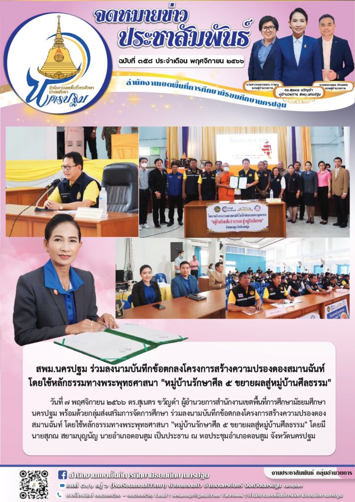 สพม.นครปฐม ร่วมลงนามบันทึกข้อตกลงโครงการสร้างความปรองดองสมานฉันท์ โดยใช้หลักธรรมทางพระพุทธศาสนา “หมู่บ้านรักษาศีล ๕ ขยายผลสู่หมู่บ้านศีลธรรม” 11/07/202311/30/2023 ประชา สัมพันธ์ จดหมายข่าวเขต Views: 259 ประชา สัมพันธ์