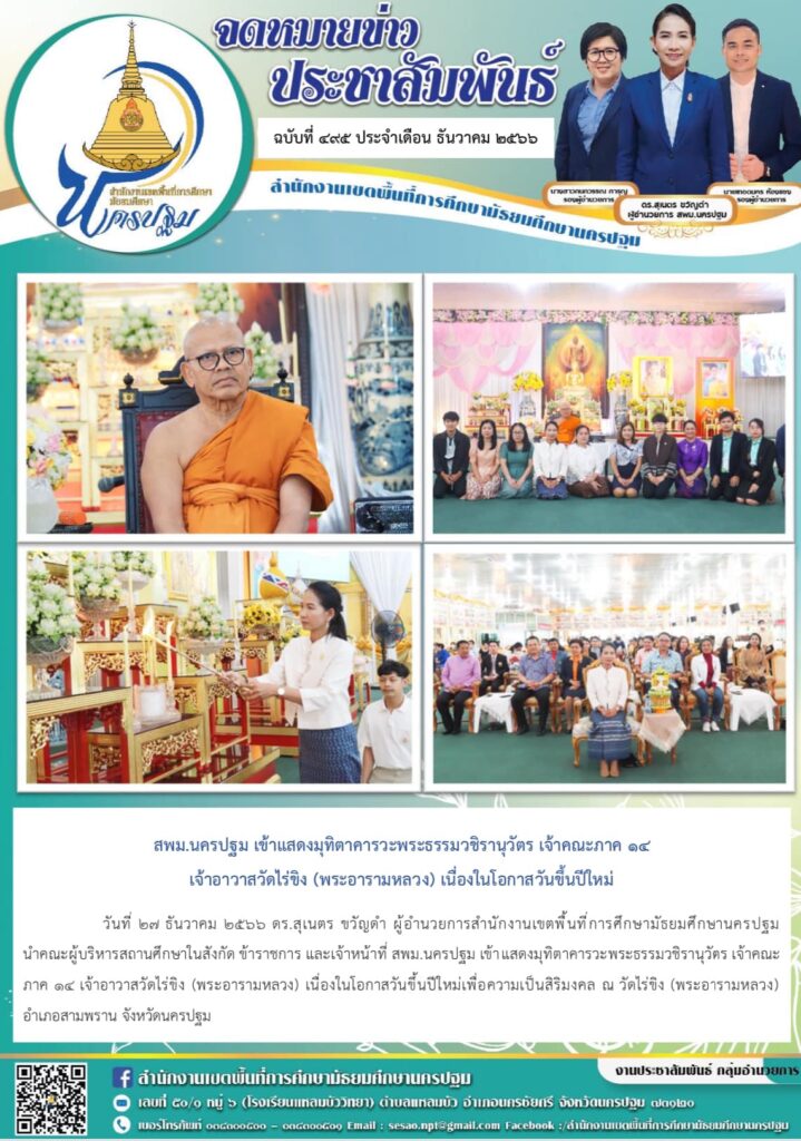 สพม.นครปฐม เข้าแสดงมุทิตาคารวะพระธรรมวชิรานุวัตร เจ้าคณะภาค ๑๔ เจ้าอาวาสวัดไร่ขิง (พระอารามหลวง) เนื่องในโอกาสวันขึ้นปีใหม่ 12/27/202301/03/2024 ประชา สัมพันธ์ จดหมายข่าวเขต Views: 374 ประชา สัมพันธ์