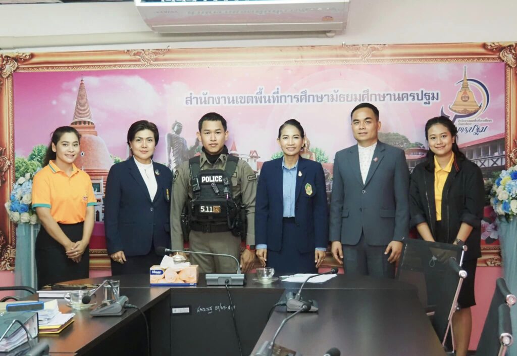 วันที่ ๑ กุมภาพันธ์ ๒๕๖๗ ดร.สุเนตร ขวัญดำ ผู้อำนวยการสำนักงานเขตพื้นที่การศึกษามัธยมศึกษานครปฐม พร้อมด้วยนายเทอดนคร ห้องแซง รองผู้อำนวยการสำนักงานเขตพื้นที่การศึกษามัธยมศึกษานครปฐม และนิติกรสำนักงานเขตพื้นที่การศึกษามัธยมศึกษานครปฐม ให้การต้อนรับ จ.ส.ต.ศิริศักดิ์ สายพร้อมญาติ สายตรวจประจำตำบลแหลมบัว เพื่อตรวจตราความสงบเรียบร้อยและความปลอดภัยบริเวณโรงเรียนแหลมบัววิทยา และสำนักงานเขตพื้นที่การศึกษามัธยมศึกษานครปฐม
