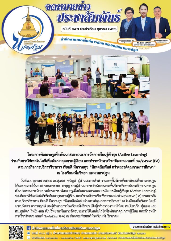 โครงการพัฒนาครูเพื่อพัฒนาสมรรถนะการจัดการเรียนรู้เชิงรุก (Active Learning) ร่วมกับการใช้เทคโนโลยีเพื่อพัฒนาคุณภาพผู้เรียน และก้าวหน้าทางวิชาชีพตามเกณฑ์ ว๙/๒๕๖๔ (PA) ตามภารกิจการบริการวิชาการ เรียนดี มีความสุข “นิเทศสัมพันธ์ สร้างสรรค์คุณภาพการศึกษา” ณ โรงเรียนเพิ่มวิทยา สพม.นครปฐม